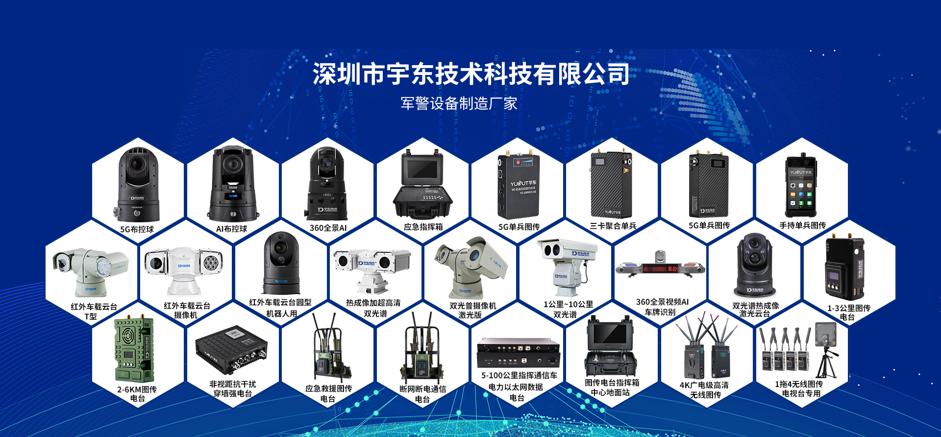 深圳市宇東技術科技有限公司,成立于2016年,是一家專業從事軍警設備系統方案的研發、生產和銷售的高科技企業。自主研發的設備有:應急單兵圖傳電臺、4/5G單兵無線圖傳、4G/5G布控球、4G/5G視頻終端、廣播影視無線圖傳、1-100KM超遠距離無線圖傳、應急指揮系統、機器人/無人車無線通信、車載云臺攝像機、移動哨兵取證系統、COFDM無線圖像傳輸應急指揮系統、雙光譜熱成像攝像機、三光普激光云臺,倒伏式升降照明燈、智能高速云臺攝像機、車載鍵盤顯示器等。主要應用于公安、消防、 交警、人防應急、城管執法、環保監控、三防應急、水利防汛、電力搶險、鐵路搶險、海事執法、海監巡查、海關邊防、碼頭監控、森林防火、油田防盜、軍事偵察、電視轉播等;適合城區、海上、山地等視頻采集部門。